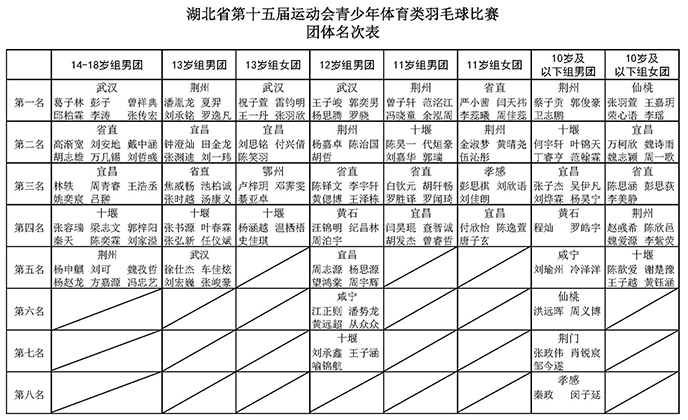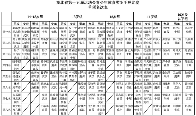 经过5天激烈比拼,湖北省第十五届运动会青少年体育类羽毛球比赛的27枚金牌终于尘埃落定,其中荆州队独占鳌头,共收获8枚金牌,武汉队7枚金牌紧随其后,十堰、仙桃、宜昌、省直等队伍均有金牌进账。