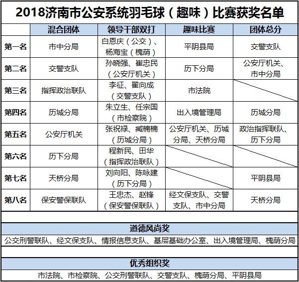 本次赛事设混合团体比赛、领导干部组双打比赛和趣味团体比赛3个项目,来自济南公安系统及其他机关单位合计17支代表队、近300名运动员参赛。作为业余爱好者,选手们非常珍惜此次比赛交流的机会,他们在紧张的赛事中发挥团结协作、奋不顾身的精神,竭尽全力为集体争取荣誉。