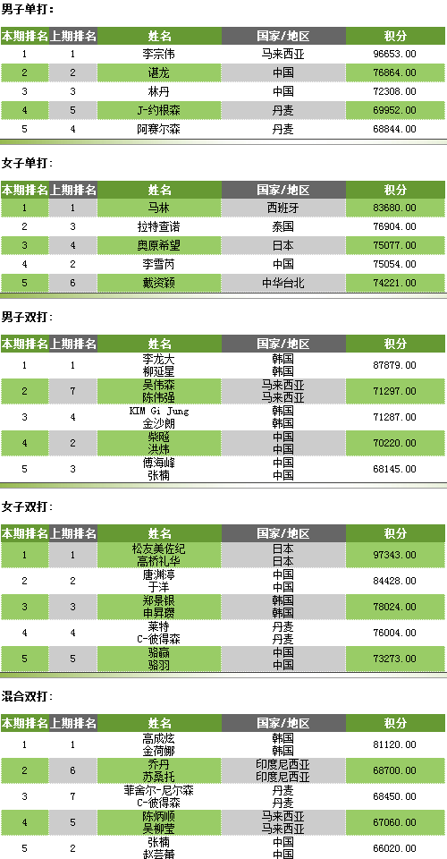 男单方面,马来西亚名将李宗伟继续高居榜首,谌龙紧随其后,林丹排名第三。丹麦双雄约根森和阿塞尔森交换座次,约根森升至第4,阿塞尔森退居第五。丹麦超级赛获得亚军的韩国一哥孙完虎上升一位来到第6,田厚威退至第7。中华台北名将周天成位列第8,上周在丹麦公开赛折桂的泰国人萨恩索姆布恩苏克排名飙升9位,来到第9,英格兰好手欧塞夫位列第10。